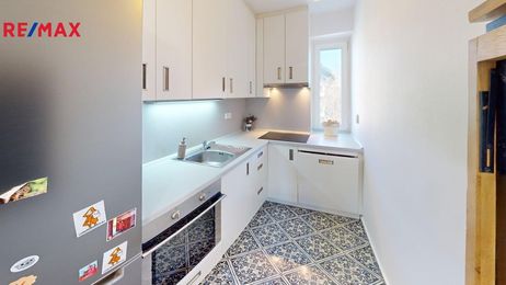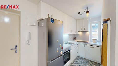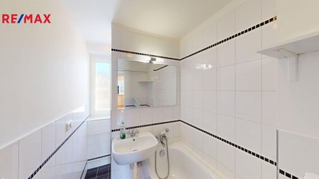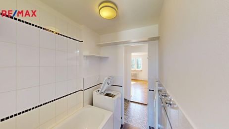 Vybavení pro okamžitý start: Kuchyň je kompletně vybavená a v koupelně s vanou na vás již čeká pračka. Stačí si přivézt postel a můžete bydlet.